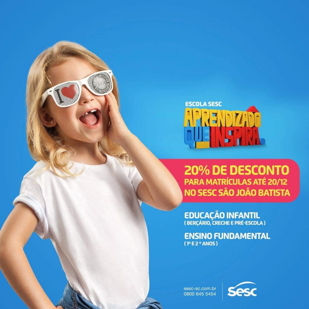 O Sesc Santa Catarina (Serviço Social do Comércio) referência em Educação, iniciou no dia 16/11, as matrículas para sua nova escola em São João Batista. No total, são 145 vagas para o ano letivo 2019, distribuídas nas atividades de Educação Infantil Bilíngue (Creche e Pré-Escola integral), Ensino Fundamental (1º e 2º ano, vespertino) e Projeto Habilidades de Estudo (contraturno escolar, matutino e vespertino, para crianças de 6 a 11 anos). As inscrições podem ser efetuadas na CDL de São João Batista, na Rua Nereu Ramos, 279, Centro, das 14h às 17h e os valores das mensalidades consultados no local. O edital e demais documentos para matrícula estão disponíveis em: http://www.sesc-sc.com.br/escola.