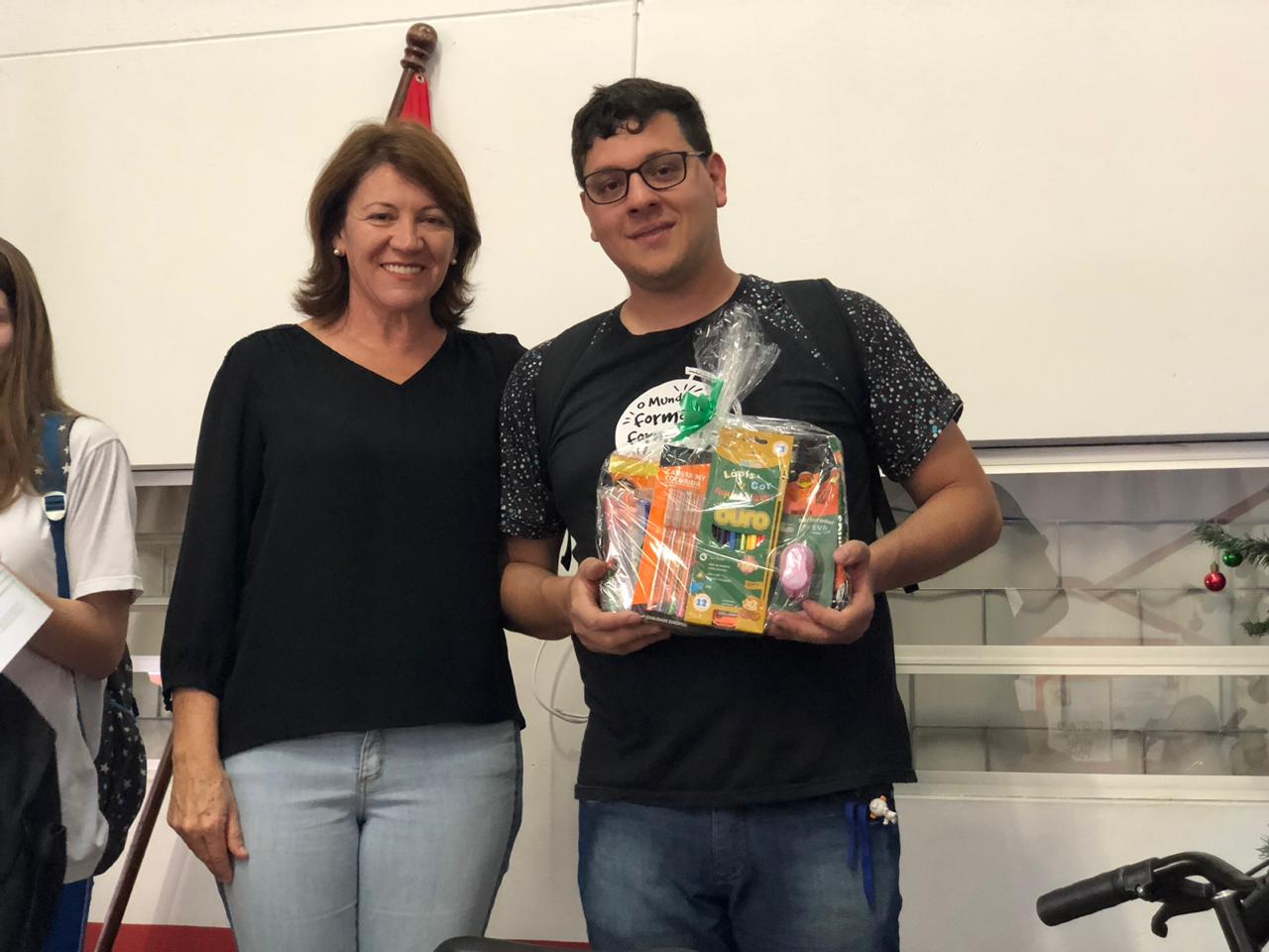 Na manhã desta quinta-feira (06), William (Diretor Executivo da CDL), Graziella de Oliveira Gomes (Vice-presidente da CDL) e Roseli Peixer Tomasini (Secretária da Educação), fizeram a entrega dos prêmios aos vencedores da etapa municipal.